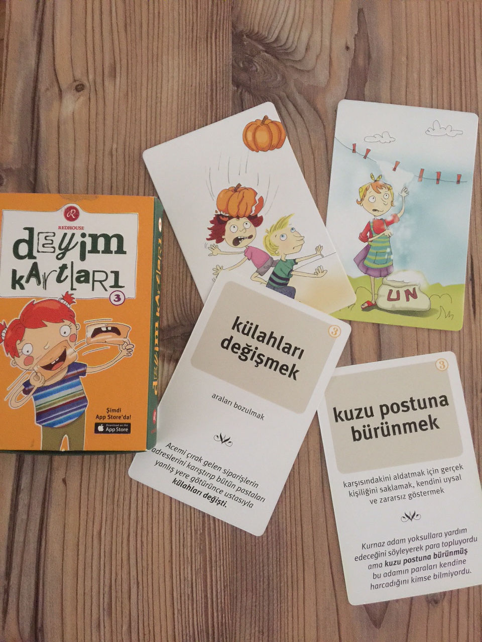 Bu deyim kartlarını da Nezih’de bulmuştum. Oldum olası deyimler hep ilgimi çekmiştir. “Nasıl bulmuşlar yahu bunu?” diye de düşünürüm çoğunlukla. Çınar’a da birkaç zamandır ara sıra açıklıyorum komik bulduklarımdan bazılarını. O yüzden görünce atladım bu kartlara da. Akşam okuldan sonra ya da yemek sonrasında koltuğa gömülüp koyun koyuna resimlere bakarak tahmin etmeye çalışıyoruz deyimleri. Bazıları o kadar absürt ki Cancan yanına bile yaklaşamıyor tahminlerinde ama 🙂